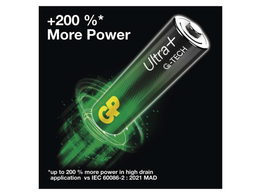 Představujeme vám nejnovější řadu alkalických baterií ULTRA+, která disponuje průlomovou technologií G-TECH. Tato revoluční technologie propůjčuje bateriím až o 200 % větší výkon než mají standardní alkalické baterie dostupné na trhu.