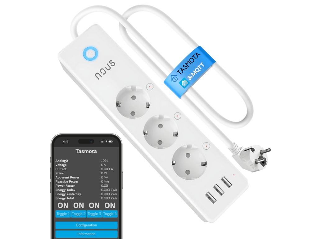 NOUS A5T je chytrá prodlužovačka pro 230 V, která kombinuje tři síťové zásuvky a tři USB-A porty v jednom těle a přidává přímé ovládání přes Wi-Fi. Zásadní rozdíl oproti běžným „smart“ prodlužkám je předinstalovaný firmware Tasmota: zařízení se ovládá lokálně přes vlastní webové rozhraní a umí komunikovat přes MQTT, takže se dá přímo zapojit do domácí automatizace bez závislosti na jedné konkrétní mobilní aplikaci.