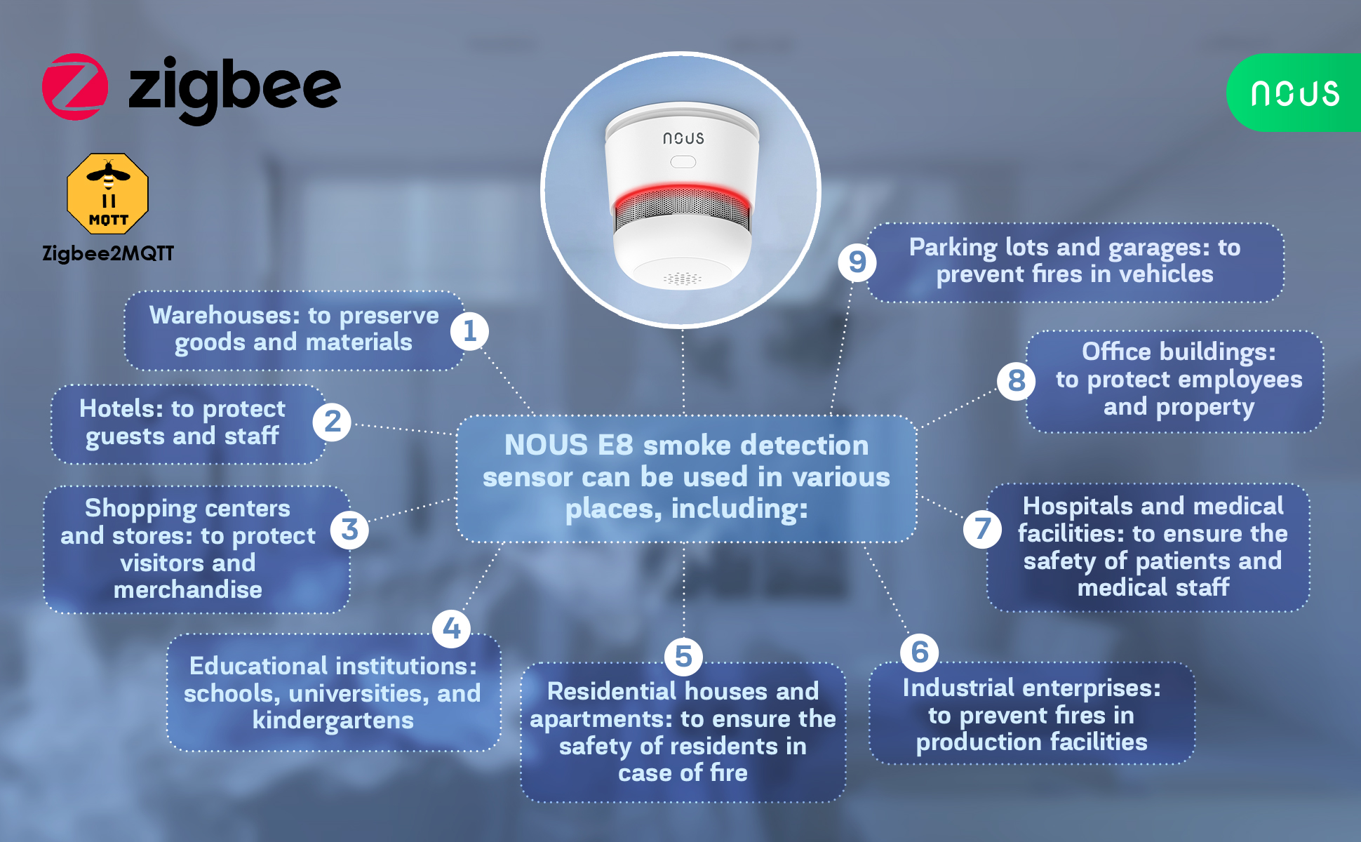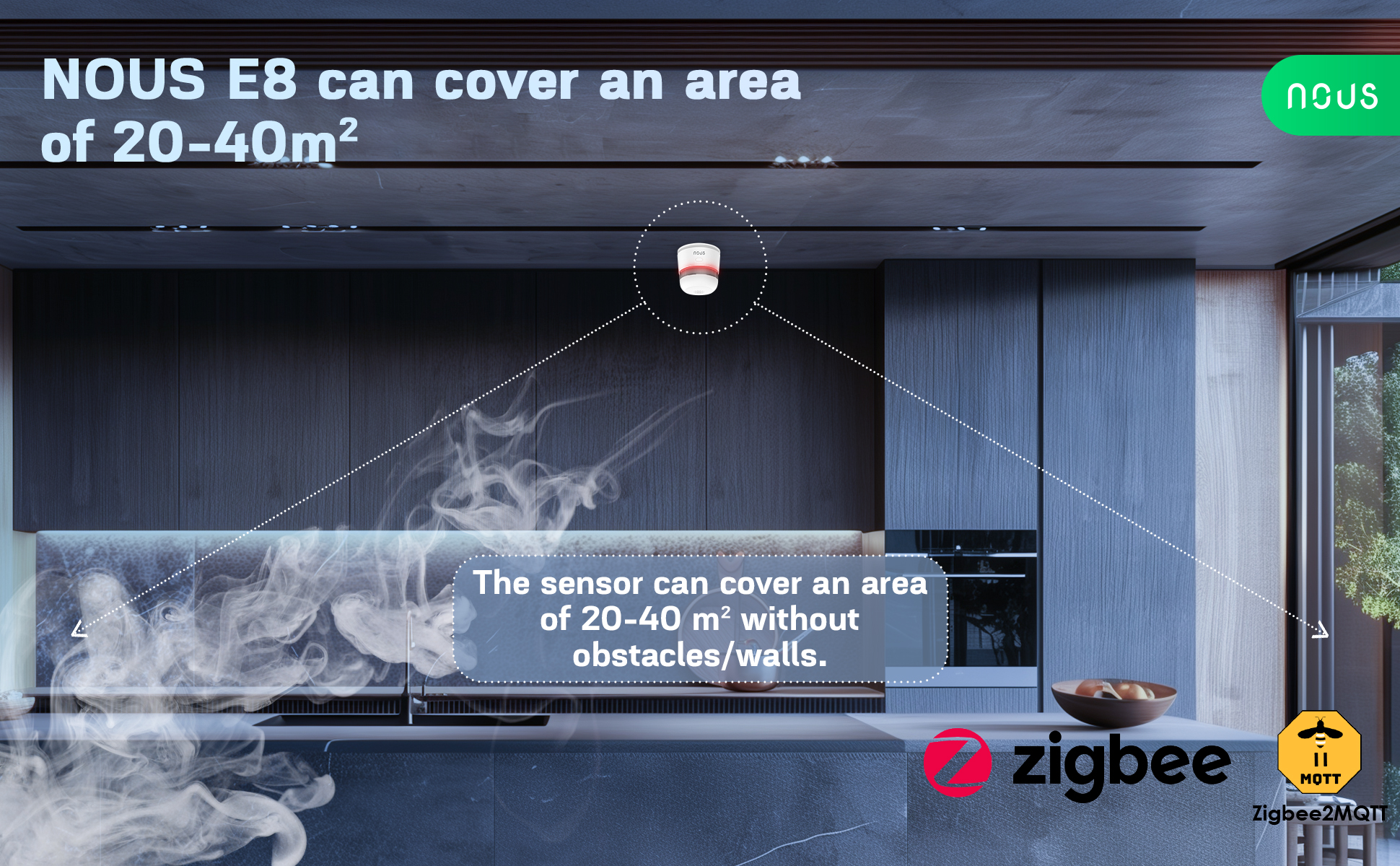 Nous E8 pokrývá prostor o velikosti 20 – 40 m2 (bez překážek či stěn). Doporučená výška montáže je 2,5 – 6 metrů, ideálně uprostřed stropu pro rovnoměrné rozpoznání kouře. Senzor je vybaven profesionálním labyrintovým designem, který minimalizuje riziko falešných poplachů způsobených prachem, hmyzem či vlhkostí.