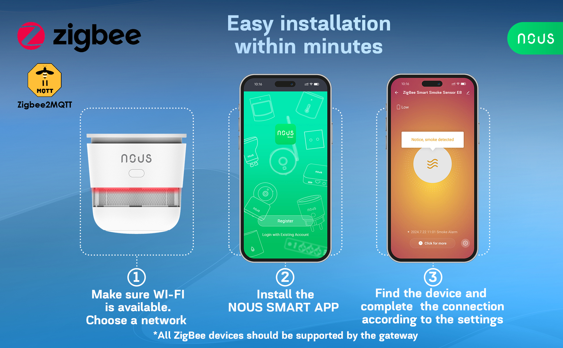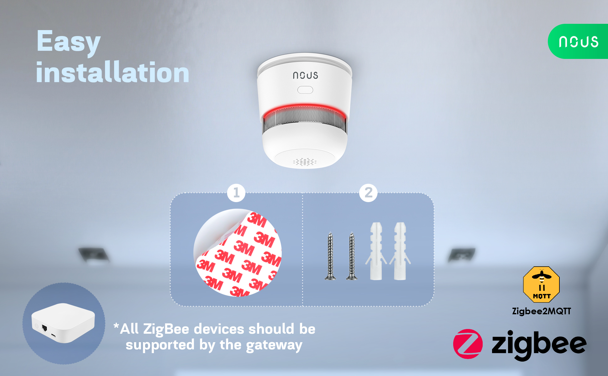 Instalace senzoru je jednoduchá – senzor stačí připojit k Zigbee síti pomocí Nous Smart Home aplikace a spárovat jej s kompatibilní bránou. Montáž je možná pomocí přiložené 3M lepicí pásky nebo šroubků. Po instalaci se senzor automaticky synchronizuje a je připraven k provozu.