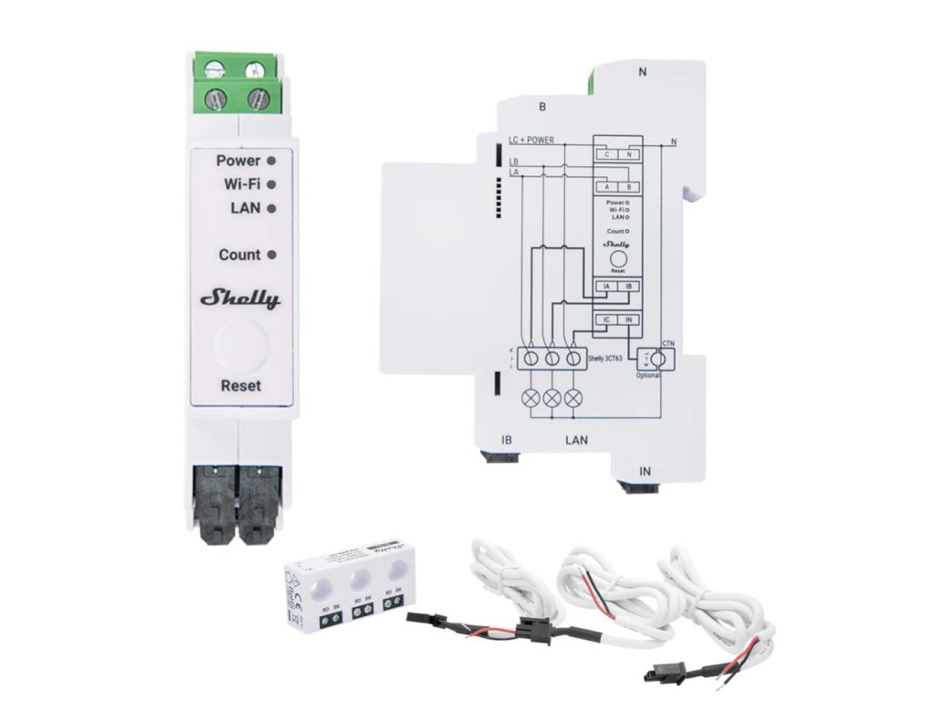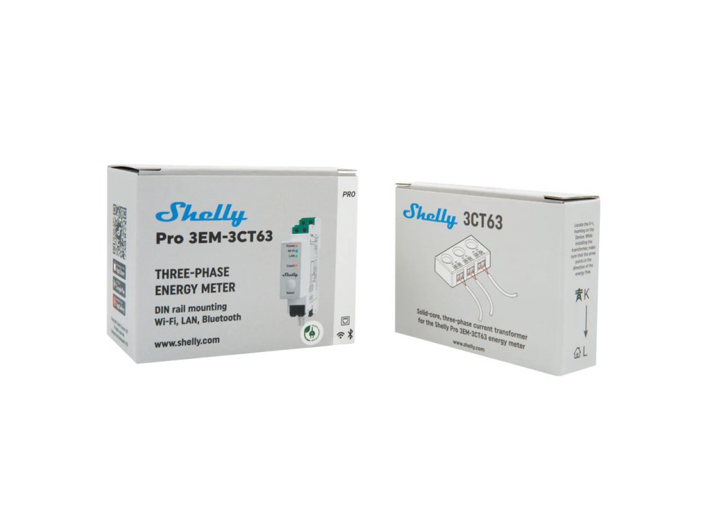 Shelly Pro 3EM-3CT63 je profesionální jednofázový nebo třífázový elektroměr určený pro montáž na DIN lištu. Umožňuje přesné měření spotřeby energie v reálném čase pomocí speciálního třífázového kombinovaného proudového transformátoru (CT), který se instaluje přímo nad jistič. Je vhodný pro domácnosti, komerční budovy, průmyslové provozy i obnovitelné zdroje energie.