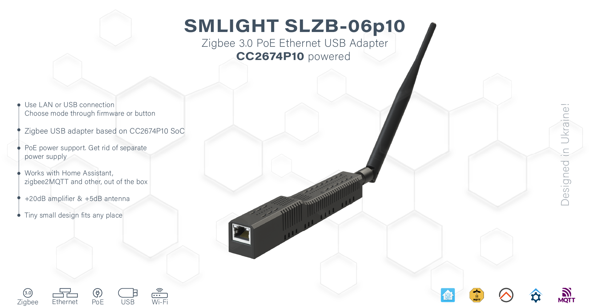 SMLIGHT SLZB-06p10 je výkonný, platformově nezávislý Zigbee 3.0 adaptér, který lze provozovat jako koordinátor nebo router. Nabízí tři způsoby připojení – Ethernet (s PoE), Wi-Fi a USB – a díky modernímu čipu Texas Instruments CC2674P10 poskytuje špičkový dosah, stabilitu a výkon pro rozsáhlé sítě chytré domácnosti. Je plně kompatibilní s Zigbee2MQTT i Home Assistant ZHA.