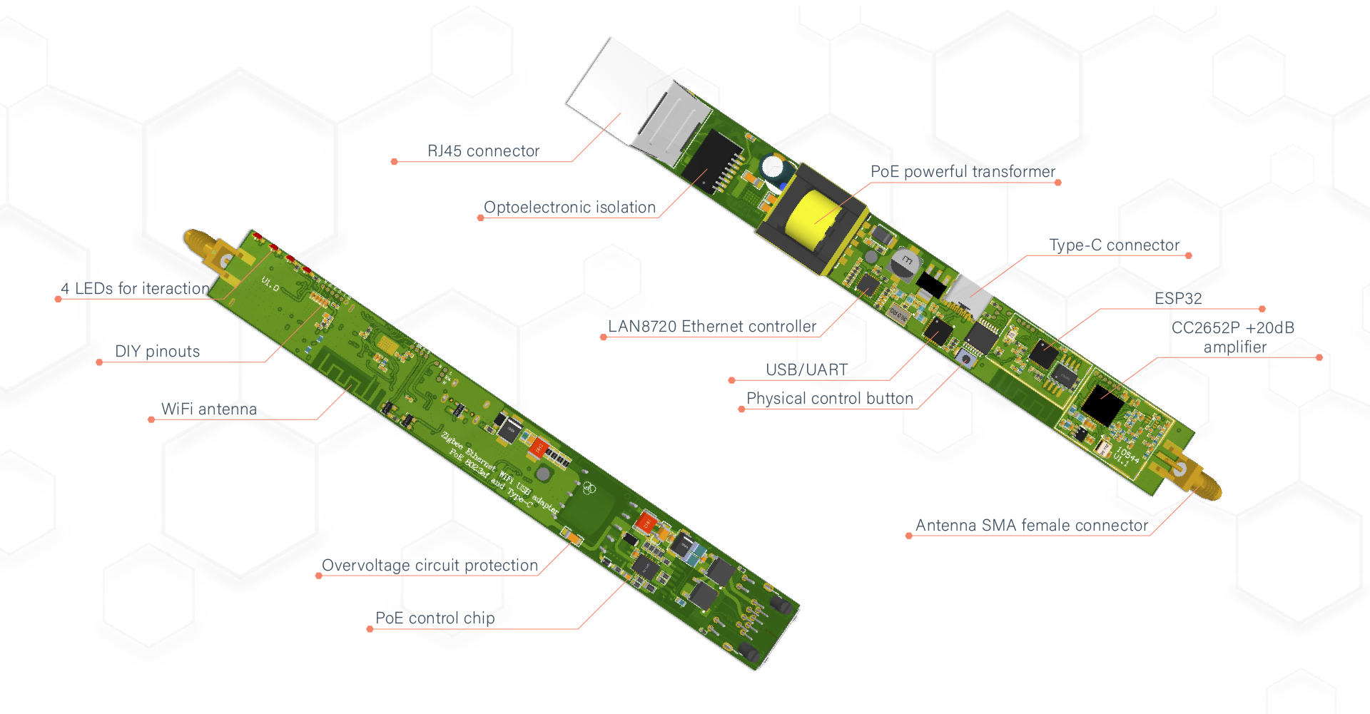 - Webové rozhraní: přepnutí režimu koordinátor/router, aktualizace firmwaru (OTA), diagnostika a logy.