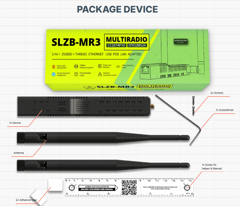 Poznámka: Vzhled balení a příslušenství se může u jednotlivých výrobních sérií nepatrně lišit. Funkce a kompatibilita se průběžně rozšiřují aktualizacemi SLZB-OS.