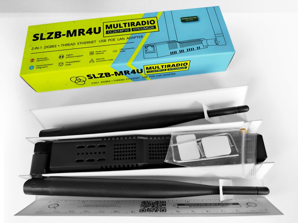 SLZB-MR4U kombinuje čipy TI CC2674P10, Silicon Labs EFR32MG26 a ESP32-S3. Dva hlavní rádiové čipy jsou určeny pro Zigbee a Thread, zatímco ESP32-S3 zajišťuje Wi-Fi a Bluetooth. Zařízení komunikuje přes 100Mb Ethernet, podporuje PoE i USB-C napájení a je vybaveno dvěma externími 5dB anténami pro hlavní rádiovou část. Wi-Fi a Bluetooth používají interní anténu na PCB.