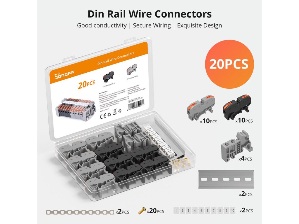 Sonoff 211 je kompletní sada konektorů pro spojování vodičů, která je plně kompatibilní se standardními 35mm DIN lištami. Tato sada usnadňuje rychlé a bezpečné zapojení vodičů v rozvaděčích, přičemž zajišťuje přehlednou organizaci a správu kabeláže. Díky vysoké kvalitě materiálů a inovativnímu designu je ideální volbou pro profesionální i domácí elektroinstalace.