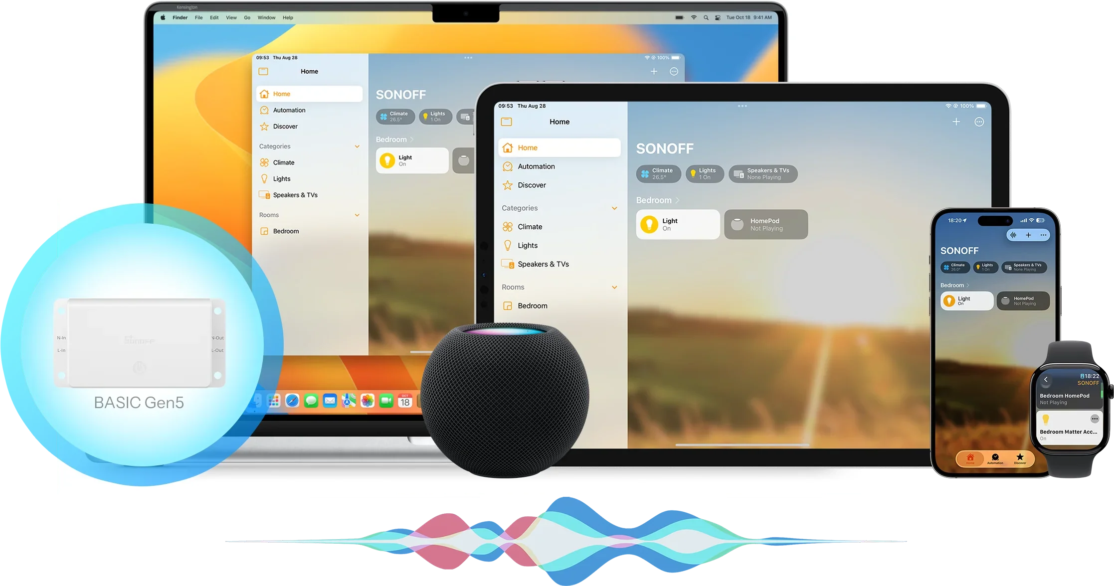 SONOFF Basic Gen5 promění světla či spotřebiče na chytrá zařízení s ovládáním přes aplikaci, hlas a automatizace. Díky Matter funguje napříč platformami (Apple Home, Google Home, Alexa, SmartThings, Home Assistant), nabízí režim Magic Switch pro zachování funkce stávajícího nástěnného vypínače a lokální řízení pro rychlé reakce i bez cloudu. Kompaktní provedení usnadňuje instalaci do rozvodné krabice nebo přímo do trasy vedení ke spotřebiči.