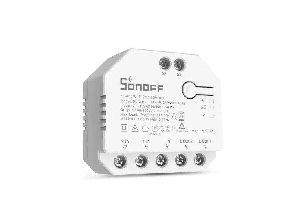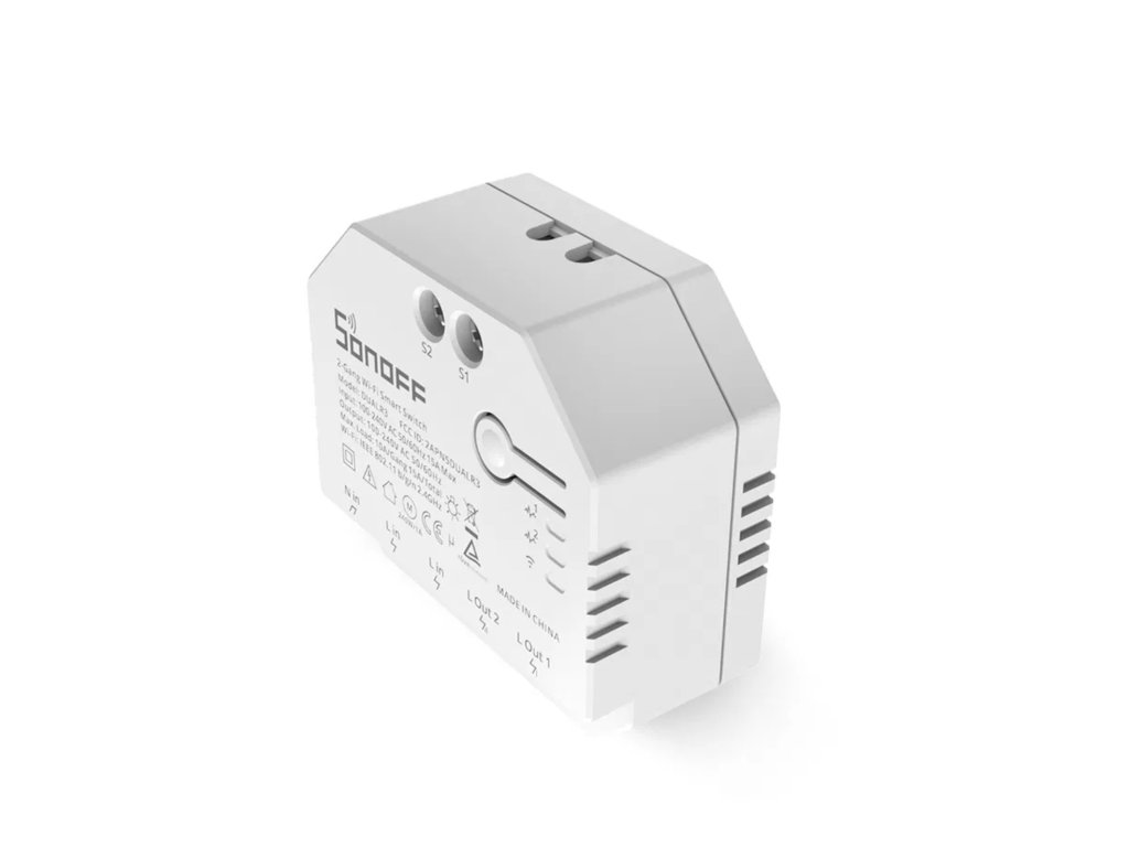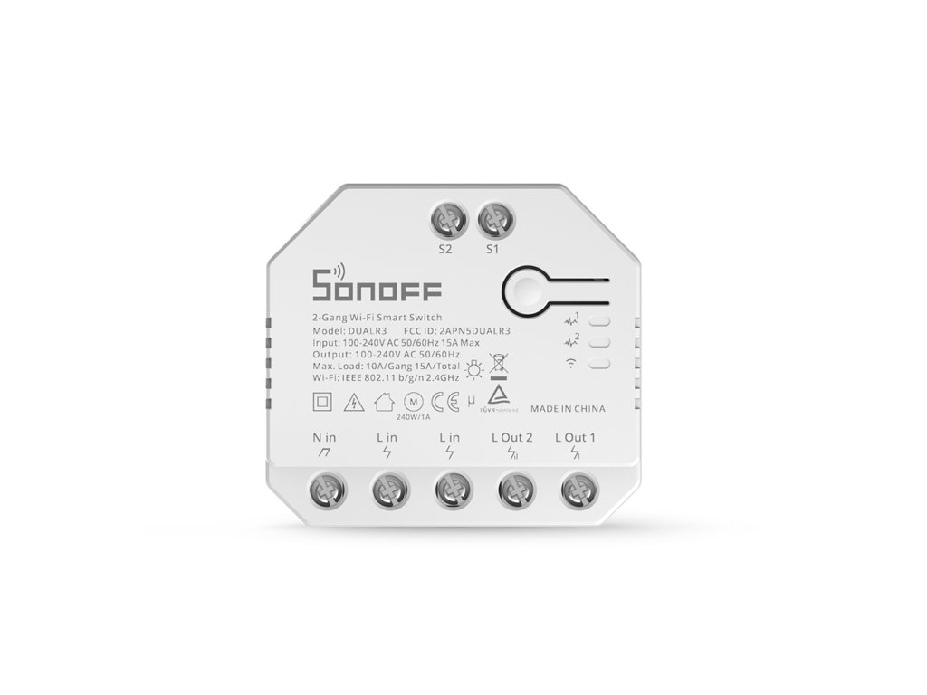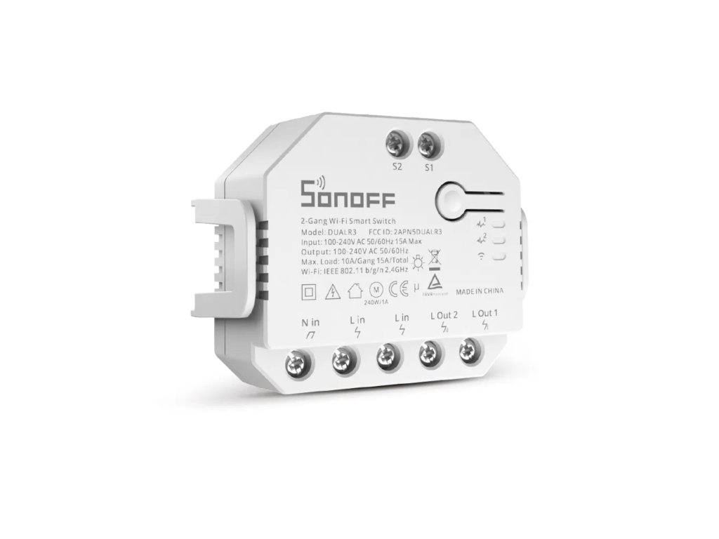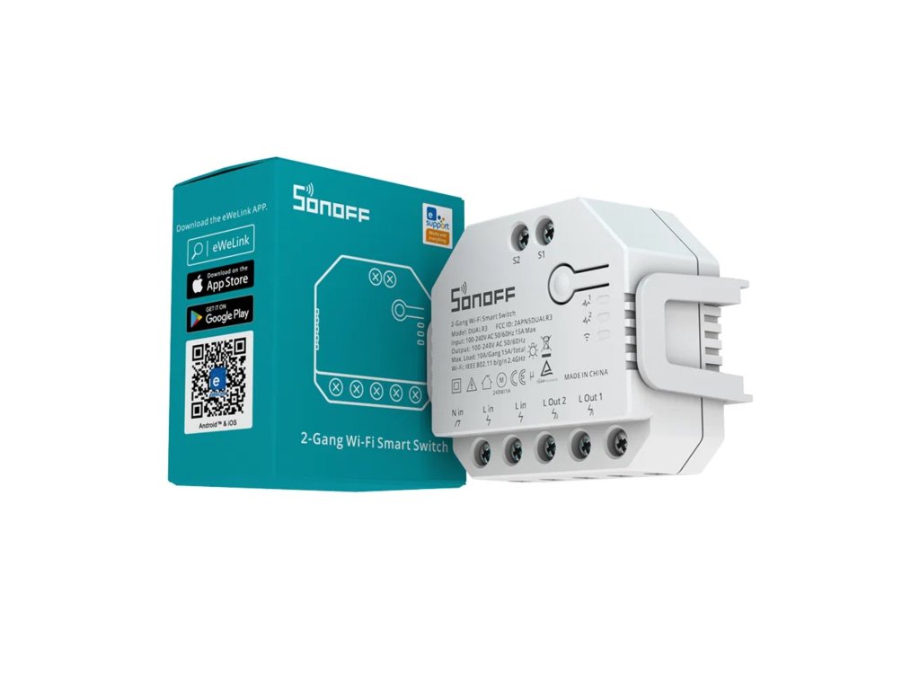 Všechny Wi-Fi spínače Sonoff jsou určeny k ovládání elektrických spotřebičů vzdáleně přes internet. Využívají cloudového prostředí Amazon Web Services (AWS) pro zabezpečené připojení do internetu a ovládání pomocí připojené aplikace eWeLink z mobilního telefonu (Android i iPhone) odkudkoliv na světě. Aplikace eWeLink a služby spojené s provozem vypínačů jsou poskytovány zdarma.Napájení je řešeno přímo z 230 V a výstupem (rovněž 230 V) lze ovládat spotřebiče až do zátěže 10 A na okruh.Sonoff Dual R3 navíc nabízí možnost ovládání dvou nezávislých okruhů (dvou světelných okruhů, dvou spotřebičů, dvou zásuvek a podobně) do maximální odporové zátěže 2x 10 A (celkem max 15A) a současně měřit spotřebu obou kanálů zvlášťSonoff Dual R3 nabízí funkci měření spotřeby elektrické energie (POW)Součástí balení je i praktický držák pro instalaci na DIN lištuPracovní režimy spínačePřepínač – funguje jako dvoukanálový spínač s měřením spotřeby pro každý kanál zvlášť Motor – v tomto režimu je spínač vhodný například pro ovládání žaluziových motorů (ovládá dvě fáze). Po kalibraci motoru umožňuje i částečné otevření/zavření (vytažení/zatažení) rolety nebo žaluzie. Současně spínač měří celkovou spotřebu spínače (bez rozdělení na jednotlivé kanály) Měřič – Pouze meří spotřebu a shromažďuje data pro oba kanály zvlášť, bez možnosti ovládání (zapínání a vypínání) spínače.Data měřiče není možné použít pro případné scény Základní popis funkcíRemote ON/OFF – Zapnutí a vypnutí na dálku odkudkoliv na světě pomocí aplikace eWeLink, která je dodávána a jejíž používání je vždy zdarmaSync Status – Stav spínače (zapnuto/vypnuto) je v aplikaci eWeLink zobrazován v reálném čase bez ohledu na to, jakým způsobem došlo k přepnutí vypínače (přes eWeLink na dálku, časovačem, chytrou scénou...)Timing – Bohaté možnosti programovaní vypínače (časovač, pravidelné zapínání a vypínání v určitých intervalech, odpočet času...)Share Control – Sdílení spínače s více uživateli (například s ostatními členy domácnosti)Smart Scene – Chytré scény - programování vypínače na základě událostí z jiných zařízení (například rozsvícení světla po otevření dveří, zvýšení teploty a podobně)Scene – Scény – Hromadné operace více zařízení najednouVoice Control – Hlasové ovládání - Snadná integrace s Amazon Alexa, Google HomeSpínač Sonoff Dual R3 POW umožňuje také tzv. schišťové zapojeníZapojení roletových nabo žaluziových motorůRozdíly mezi Dual R3 Pow a Dual R3 LiteSpecifikace90-250V ACMax. Proud: 10A na kanál, max 15AMax. Příkon: 2200W na kanál, max 3450 WStand-by spotřeba <0,5WBarva: BíláWiFi Standard: 802.11 b/g/nWiFi zabezpečení: WPA/WPA2Material: ABSKanálů: 2Provozní teplota: 0o - 40oCProvozní vlhkost: 5% - 90% nekondenzačníRozměry: 54 x 49 x 24 mm (D*Š*V)Hmotnost: 58gCertifikaceCETÜVFCCTasmotaAlternativní FW Tasmota - Spínač je založen na ESP32, takže proces flashování je jiný, než u ostatních spínačů. Navíc, je to titěrná práce, která zabere mnohem více času a proto si dovolujeme účtovat dvojnásobnou sazbu. Pokud si od nás přejete nahrát FW Tasmota do tohoto spínače, přidejte prosím Tasmotu do košíku 2x.Doplňkové parametry