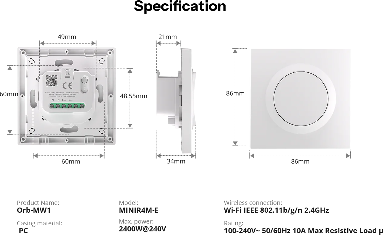SONOFF Fusion Orb-MW1 (MINIR4M-E) je chytrý nástěnný Wi-Fi vypínač nové generace se standardem Matter, navržený pro univerzální a stabilní ovládání světelných okruhů v chytré domácnosti. Patří do řady SONOFF Fusion a nabízí moderní vzhled, vysokou odolnost a kompatibilitu s běžnými EU instalačními krabicemi i designovými rámečky Orb (2/3-gang).