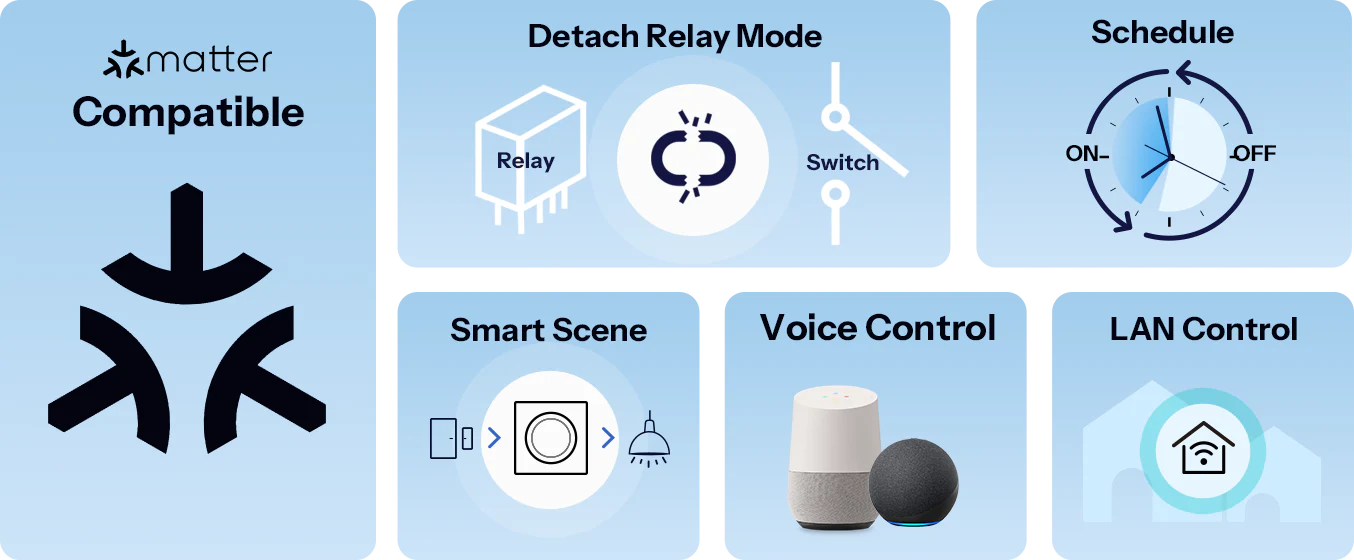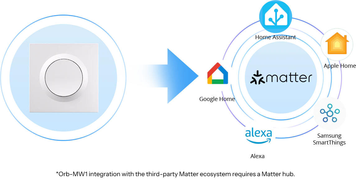 Díky technologii Matter přes Wi-Fi jej snadno připojíte do všech hlavních ekosystémů – Apple Home, Google Home, Amazon Alexa, SmartThings i Home Assistant přes Matter Bridge. Vypínač funguje také v režimu LAN (offline), takže zůstává ovladatelný i bez internetu nebo cloudu.