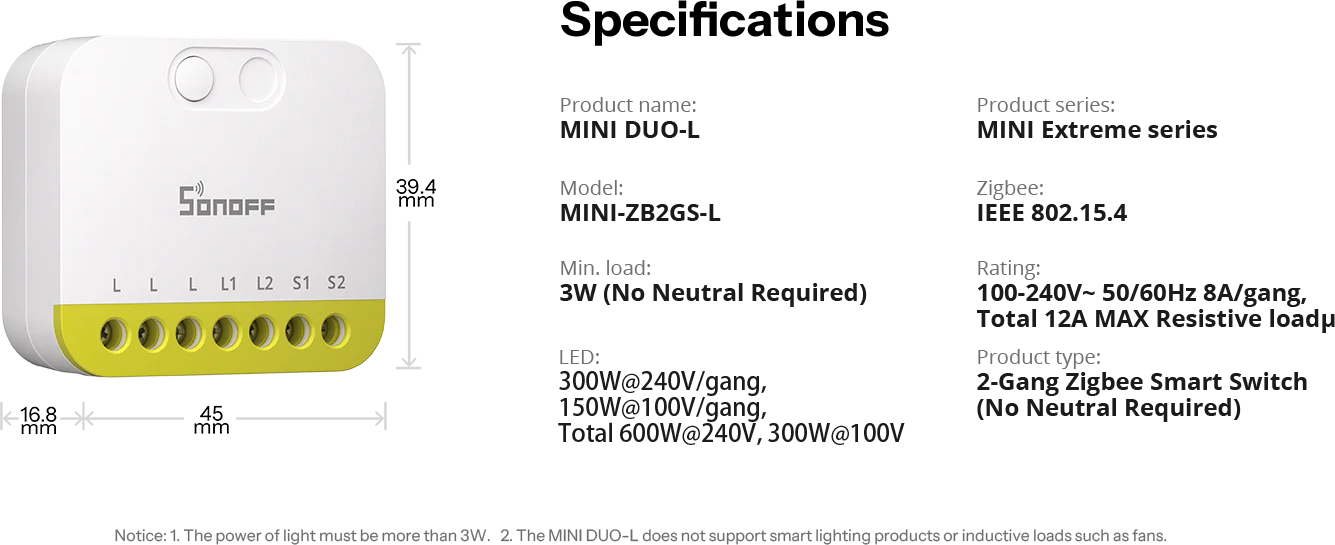 Sonoff MINI-ZB2GS-L MINI DUO-L 2kanálový Zigbee chytrý spínač (Nevyžaduje neutrální vodič)