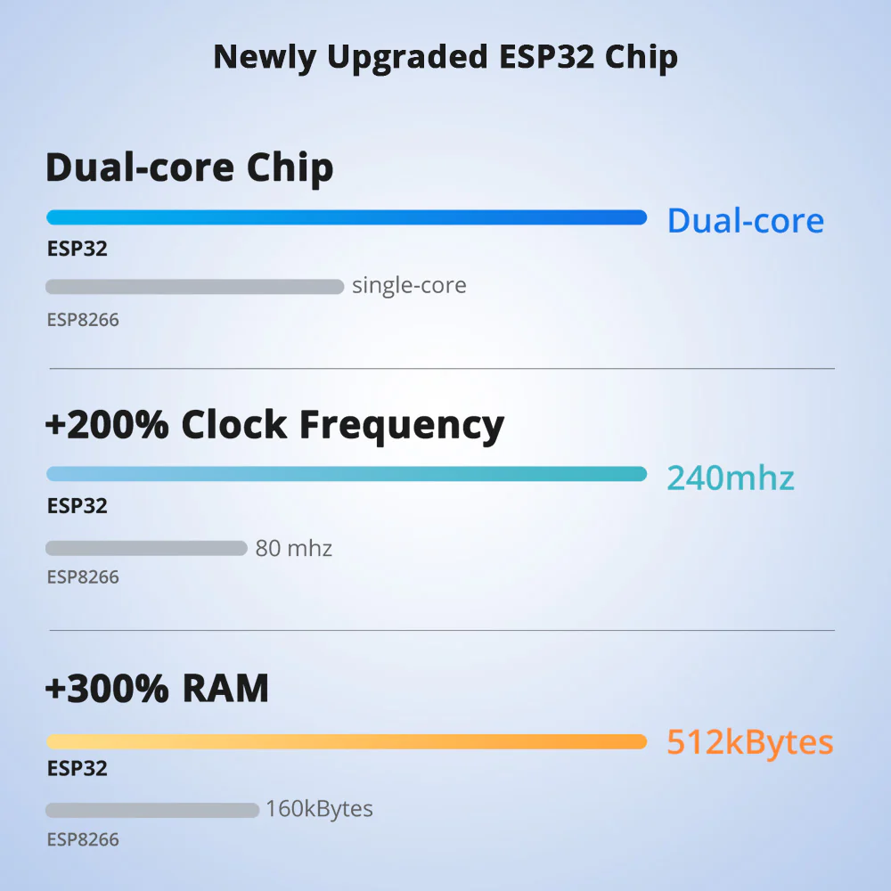 - Procesor: ESP32, dvoujádrový čip s vyšší frekvencí a pamětí než ESP8266