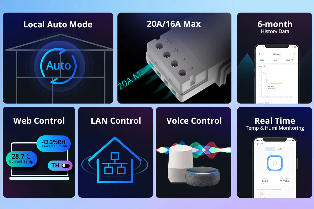 - Ovládání zásuvek nebo spotřebičů – THR316 může fungovat jako „řídící“ modul, který podle hodnoty senzoru spíná další Sonoff zařízení přes chytré scény (např. zásuvky S26, relé 4CH Pro atd.).