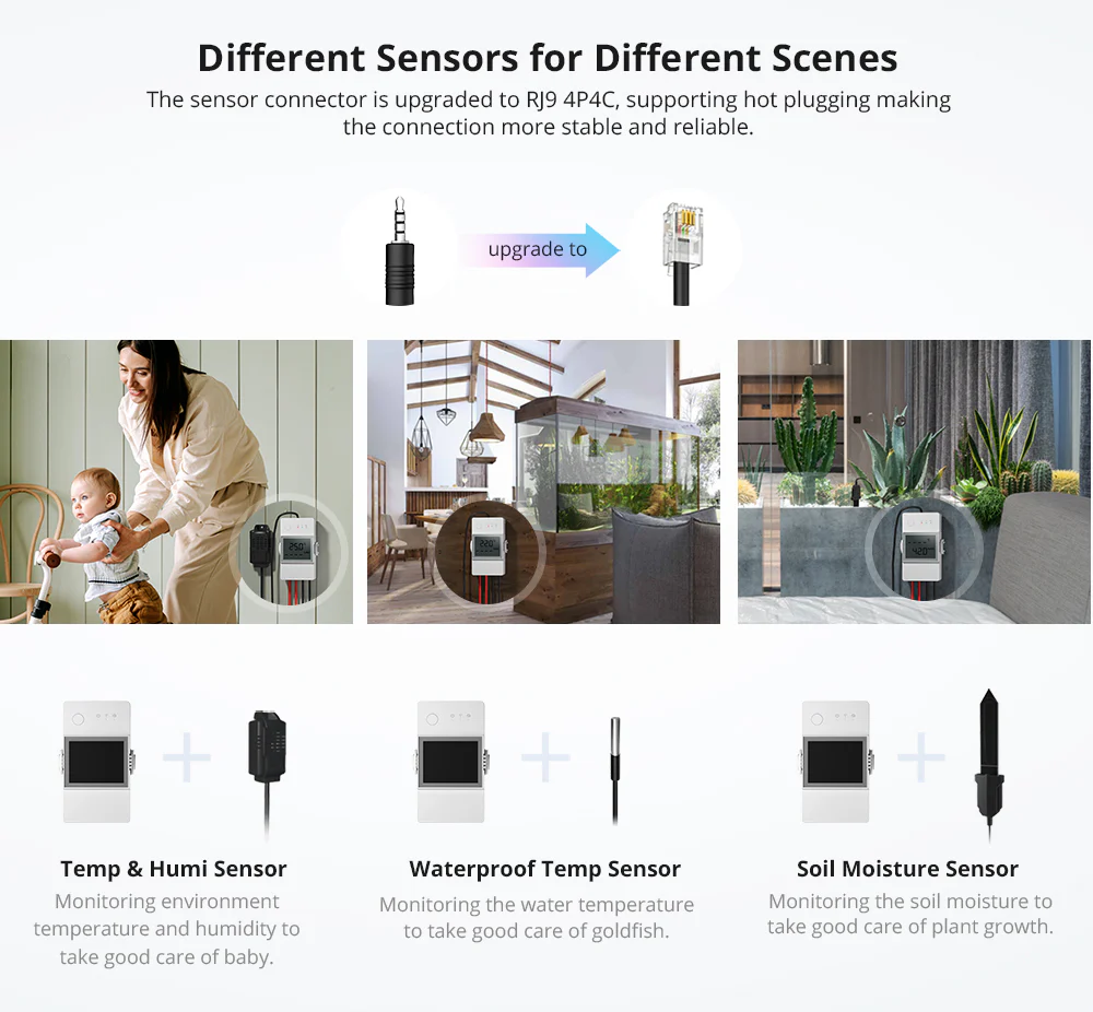 - Vstup pro senzory RJ9 4P4C – podpora teplotních, teplotně-vlhkostních a půdních senzorů Sonoff.