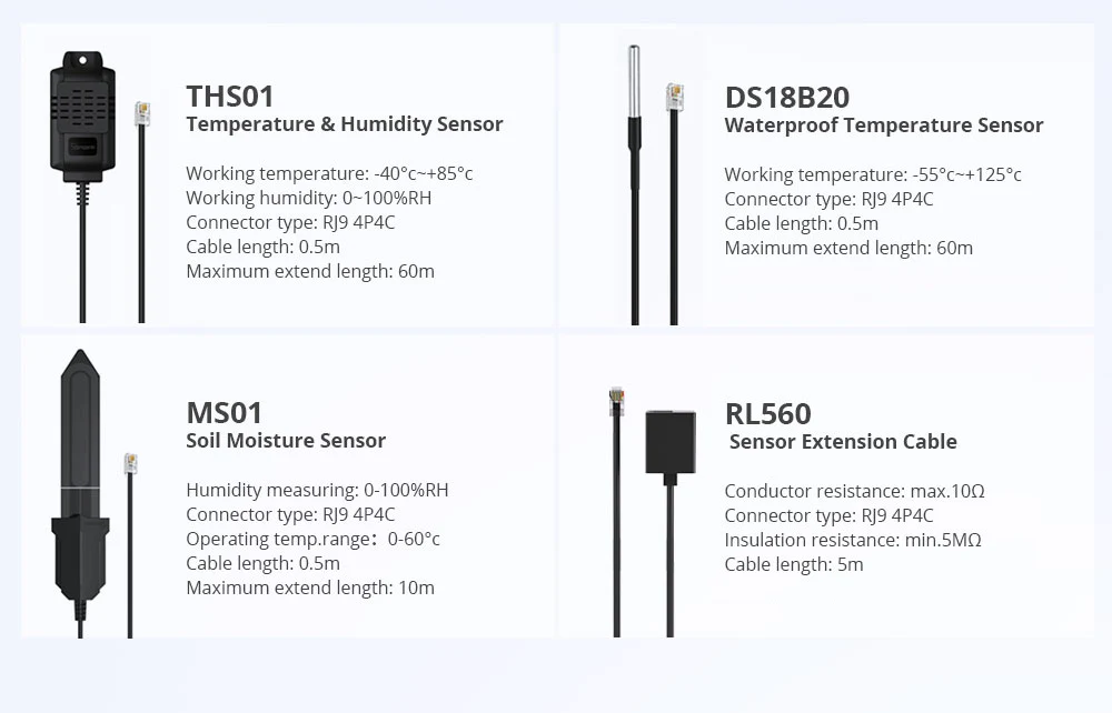 Sonoff THR316D TH Elite má vstup pro senzory s konektorem RJ9 4P4C. Senzory nejsou součástí balení a prodávají se samostatně.