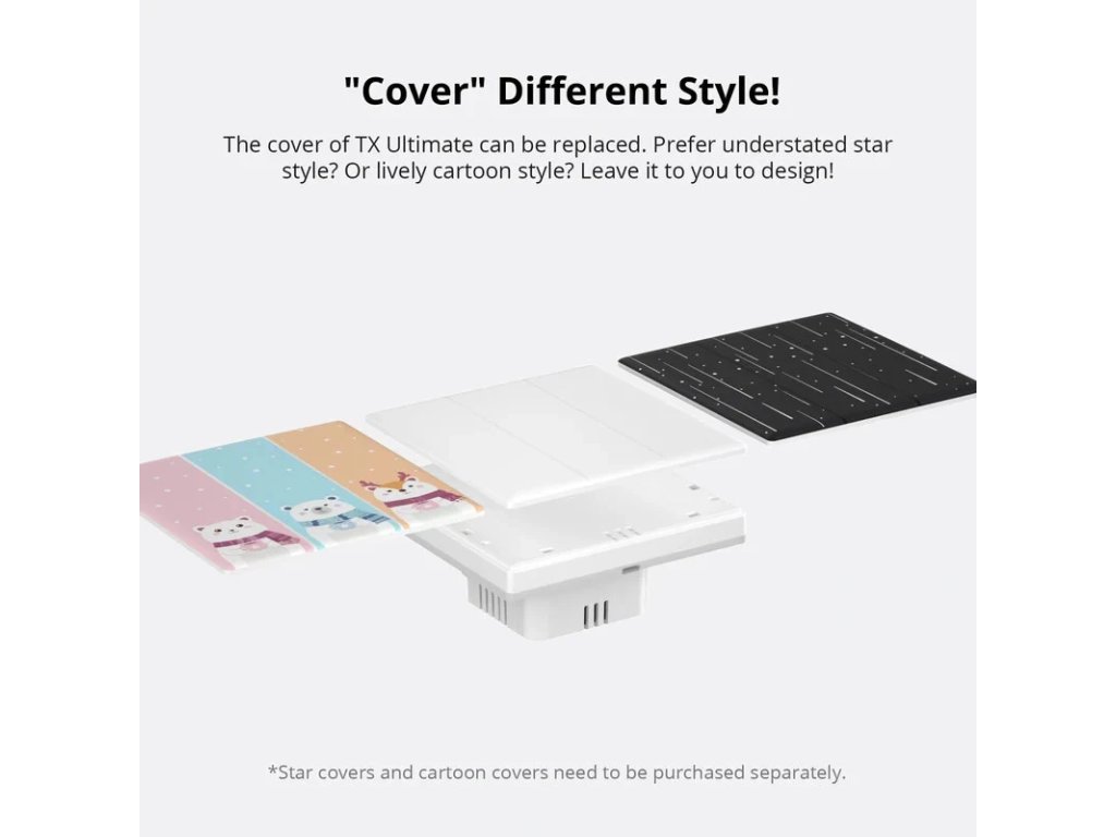 Kryt je součástí modulární série Sonoff TX Ultimate, která umožňuje snadné přizpůsobení vzhledu chytrých vypínačů. V nabídce jsou různé varianty podle velikosti, počtu tlačítek a stylu: