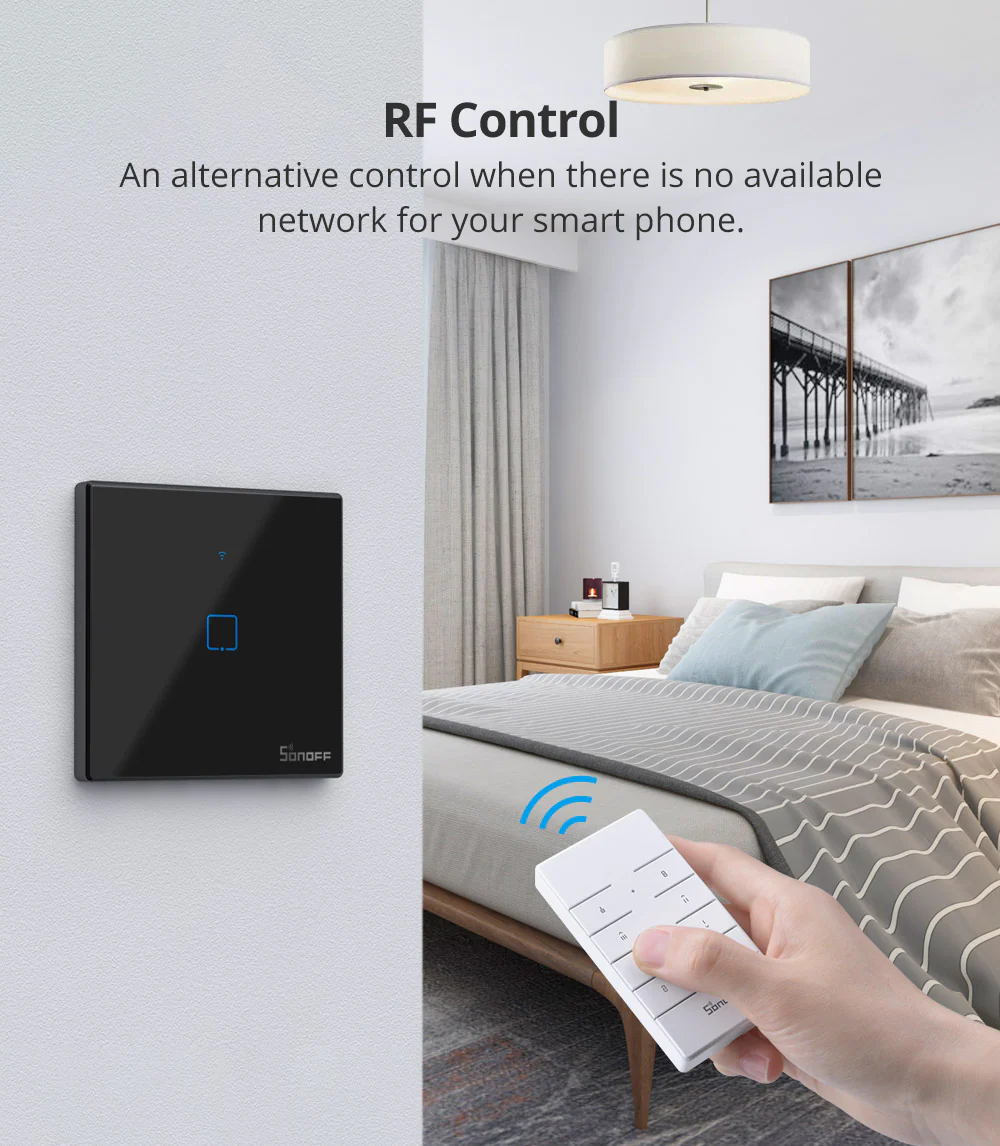 Integrovaný RF přijímač 433 MHz umožňuje ovládání vypínače bez nutnosti Wi-Fi sítě, například když nechcete používat telefon nebo dojde k výpadku internetu. Stačí spárovat vhodný RF vysílač – klíčenku, nástěnný RF ovladač nebo jiný 433 MHz dálkový ovladač kompatibilní s kódem EV1527.