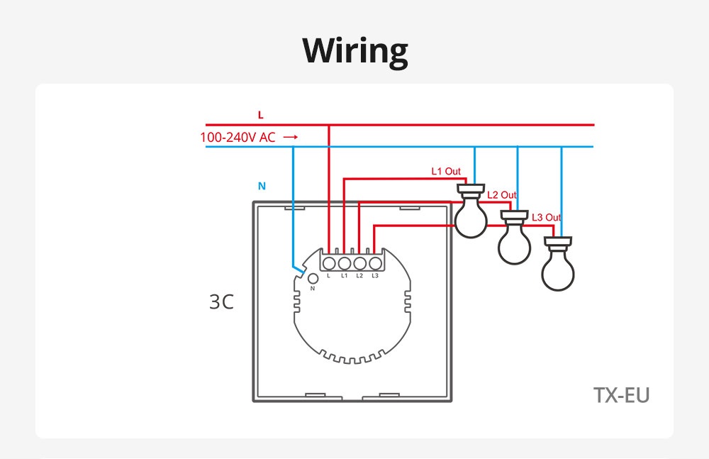 Sonoff T3EU2C-TX je určen pro montáž do standardní kulaté nebo čtvercové EU instalační krabice. Zapojení odpovídá běžnému síťovému spínači, ale vyžaduje přivedení jak fáze, tak nulového vodiče.