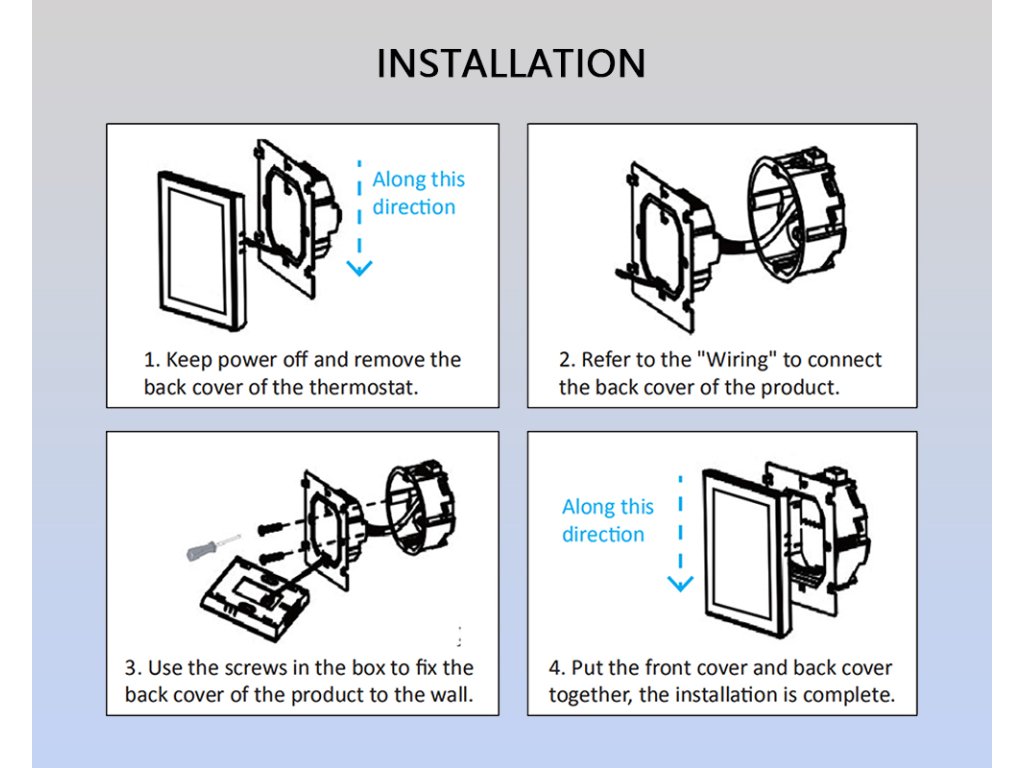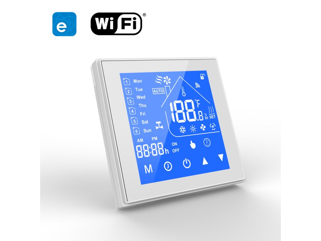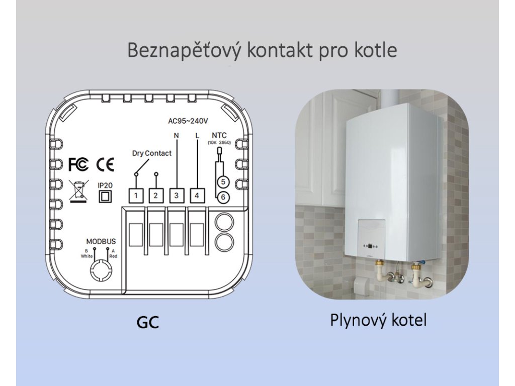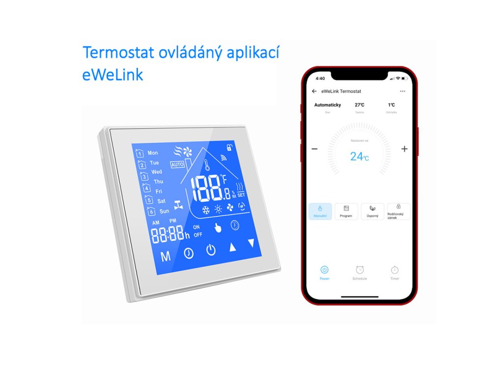 WiFi termostat, vhodný pro kotle a bojlery, s beznapěťovým spínáním (suchý kontakt), ovládaný pomocí aplikace eWeLink (pro iOS či Android).Všechny funkce termostatu, včetně týdenního programování, můžete ovládat přes svůj mobilní telefon odkudkoliv na světě.Pokud si nejste jisti výběrem termostatu, doporučujeme tento stručný článek Jak vybrat správný termostatSnadná instalaceWiFi vzdálená komunikace a ovládání pomocí cloudového serveru a mobilní aplikace eWeLinkKomfortní řízení topení s úsporou energie pomocí programovatelných funkcí a vzdáleného ovládání odkudkoliv na světěNaprogramované časové funkce jsou uloženy v termostatu a fungují i při výpadku WiFiBeznapěťové relé se zátěží max 3 ATýdenní programRežimy: Manuální řízení, Automat (týdenní program), Eco (Úsporný režim)Funkce zámek - znemožní ovládání přímo z termostatu (vhodné do pronajímaných objektů nebo jako dětský zámek)Externí podlahový senzor teploty není potřeba a proto není součástí dodávkySolidní konstrukce, dotyková tlačítka na dispeji termostatuKompaktní rozměr 86x86x14 mm; hloubka do krabice 26 mm; hloubka celkem 40 mmCE, RoHs certifikaceZapojení kontaktů3 a 4 - přívod napájecího napětí 230 V AC1 a 2 - připojení spotřebiče (kotle) - beznapěťový kontakt5 a 6 - externí (podlahové) čidlo teploty (není součástí balení)Doplňkové parametry
