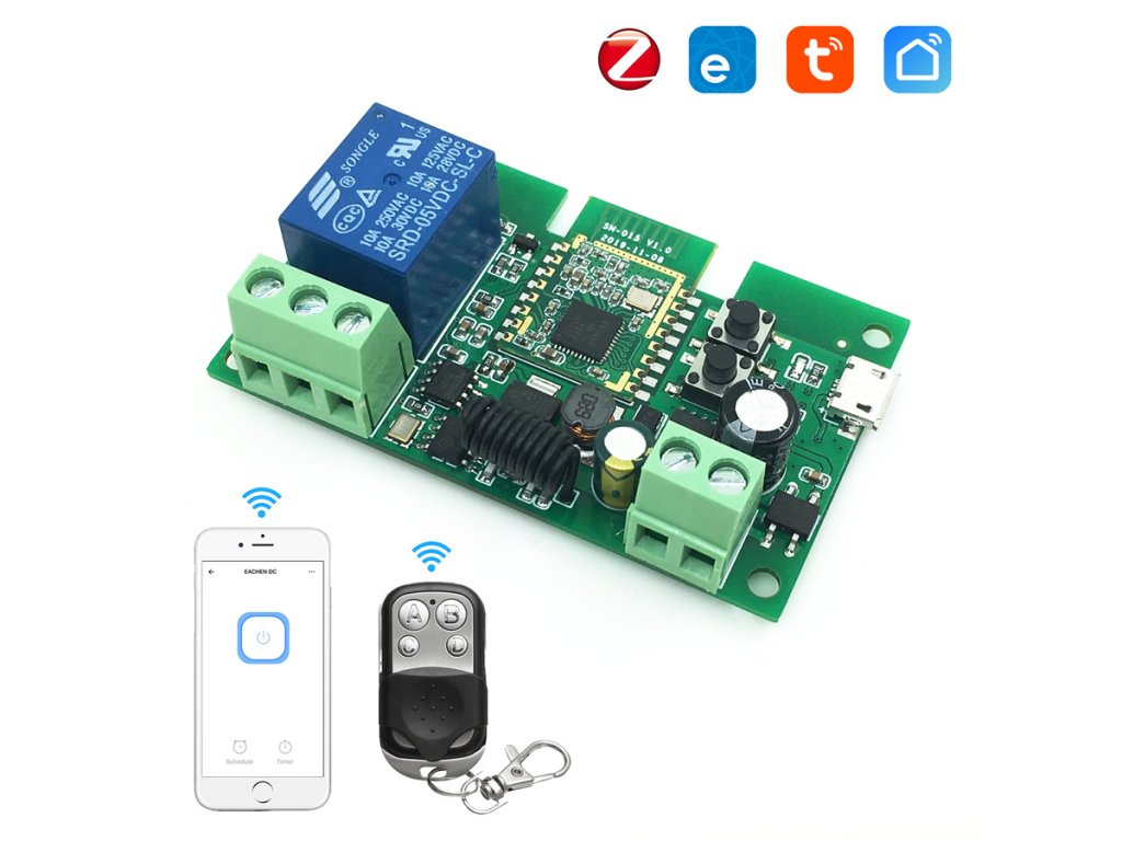 Modul lze napájet buď 5 V přes micro USB, nebo 7–32 V AC/DC na svorkovnici. Ovládáte jej přes Zigbee (Tuya, eWeLink, Home Assistant) nebo lokálně pomocí RF 433 MHz ovladačů.