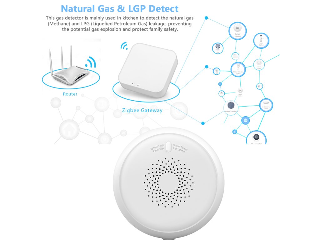 Dokáže spolehlivě rozpoznat nežádoucí přítomnost metanu (zemního plynu) a poslat tuto informaci do aplikace Tuya. Na základě této informace je možné nastavit další automatiku, jako například zavřít hlavní přivod plynu, spustit sirénu, rozsvítit světlo, nebo jen poslat upozornění na mobil.